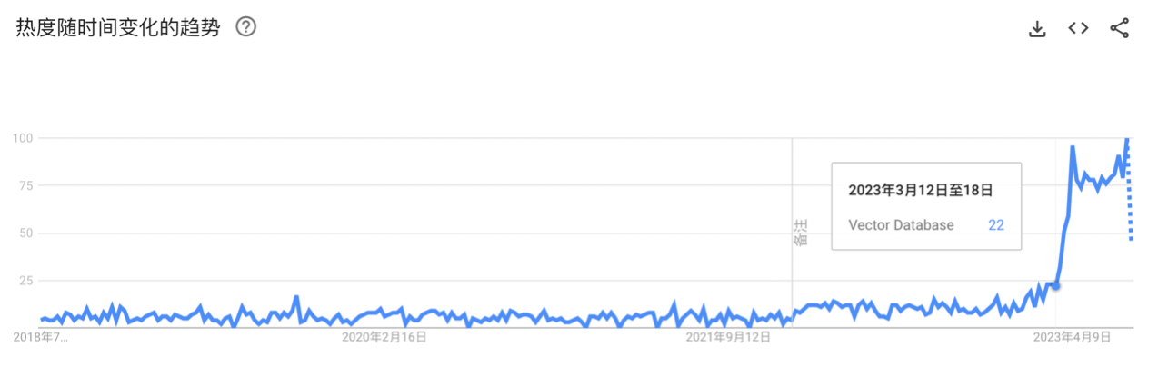 通过在Google Trends上搜索"Vector Database"(向量数据库),可以观察到自2023年3月以来,全球对该领域的关注度呈现出直线增长的趋势。