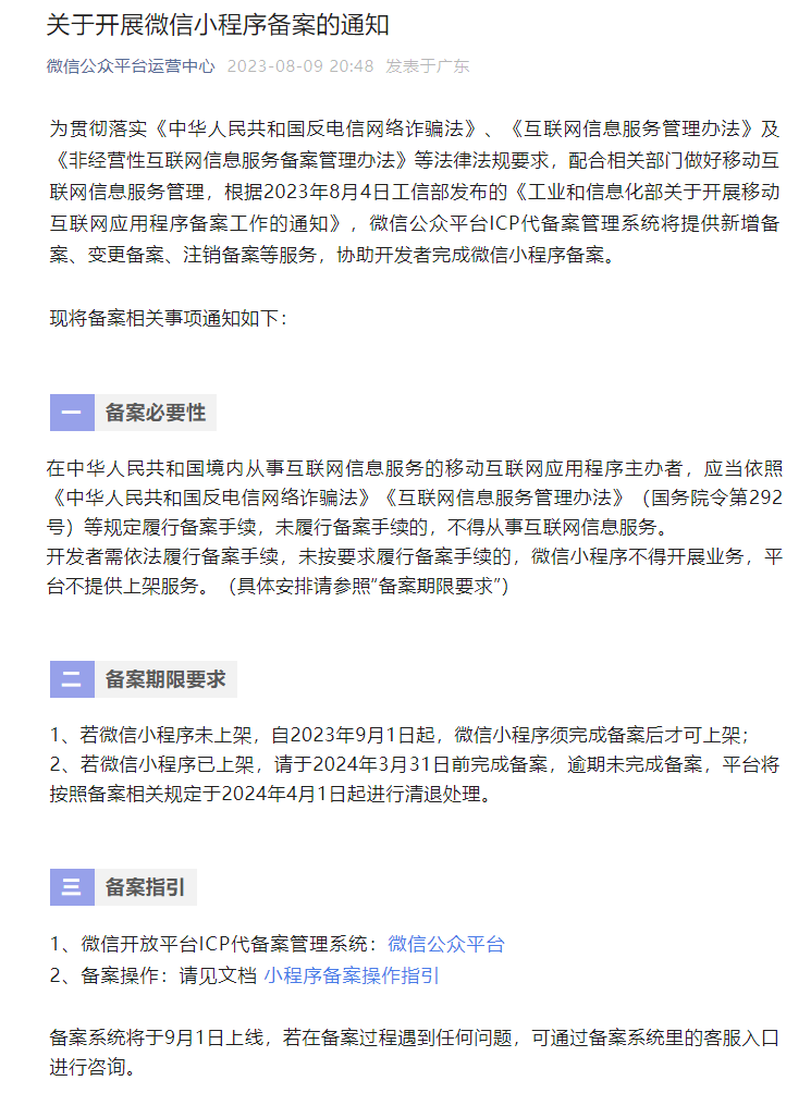 在工信部通知发布后,8月9日微信平台也快速跟进宣布,“9月1日起,微信小程序须完成备案后才可上架;若微信小程序已上架,需在2024年3月31日前完成备案,逾期未完成备案将于2024年4月1日起进行清退处理。”