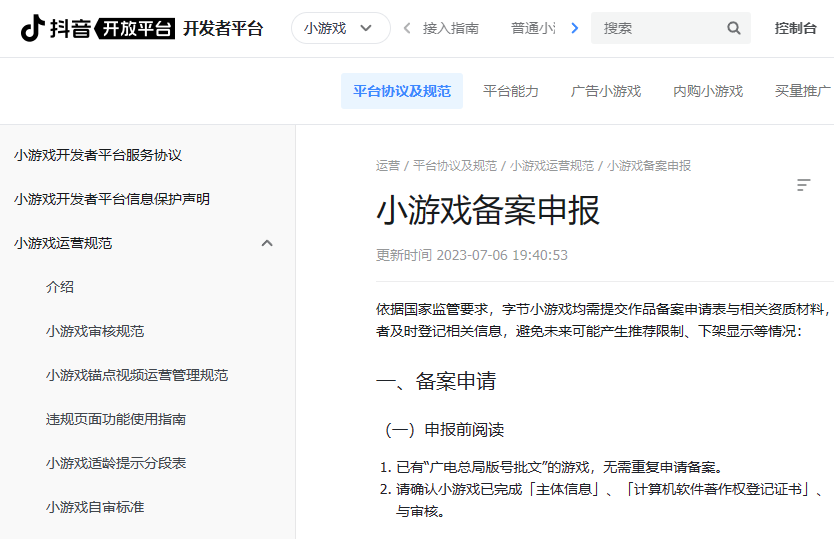 按照该规定,内购小游戏和原生App游戏要求一致上线运营需要版号,而不涉及付费的广告变现小游戏则需要备案。以抖音平台为例,抖音开发者平台公布的运营规范显示:“依据国家监管要求,字节小游戏均需提交作品备案申请表与相关资质材料,进行备案登记。”