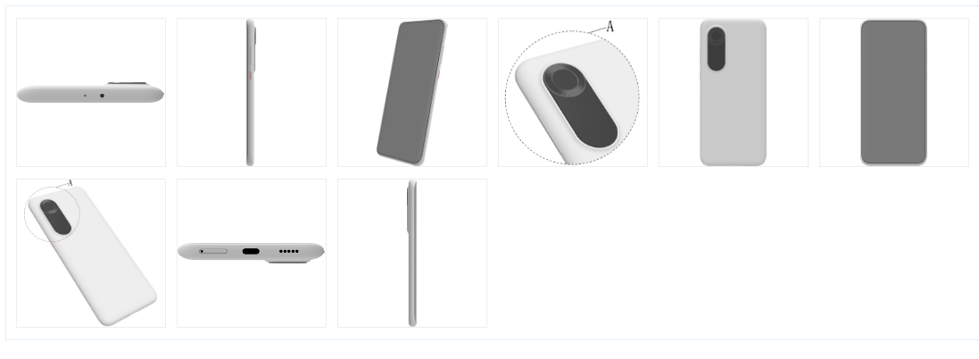 据了解,这件外观设计产品的设计要点在于产品的形状,专利摘要中有关于手机的立体图和局部放大图。如下图所示。