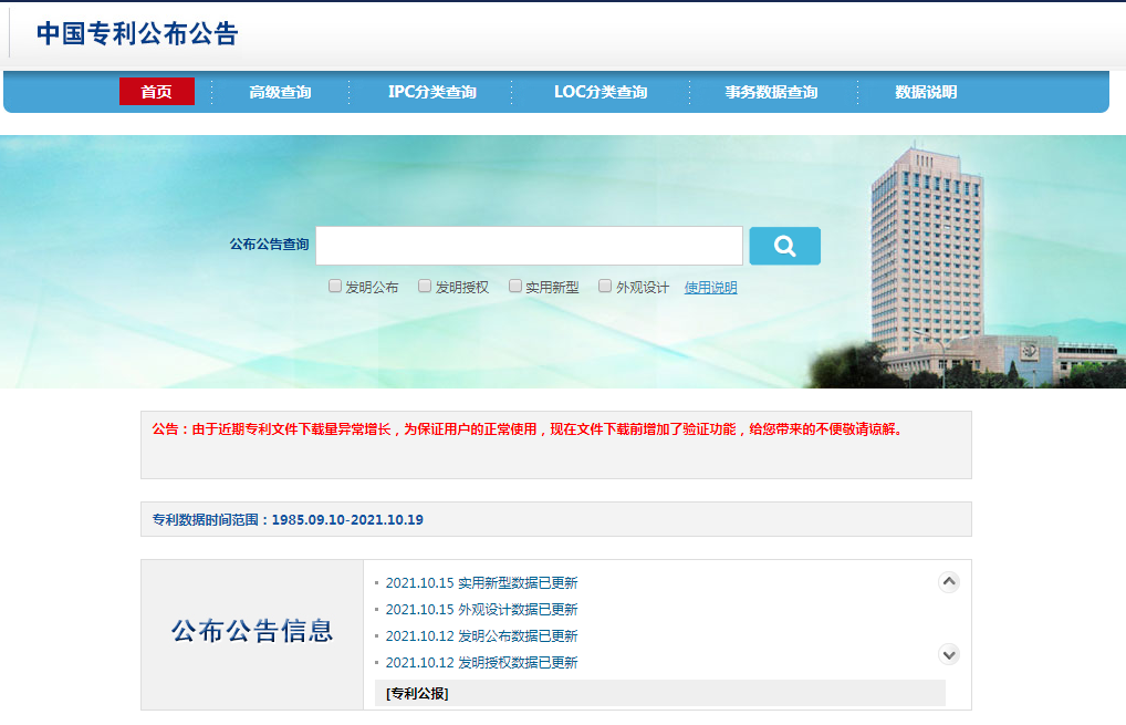 该网站包括自 1985 年 9 月 10 日以来公布中国专利信息,其检索功能可以按照发明公布、发明授权、实用新型和外观设计四种。