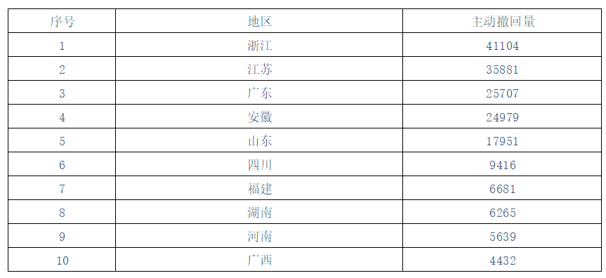 地区方面,浙江、江苏、广东主动撤回量位列前三,三地主动撤回量之和超过了总量的50%。