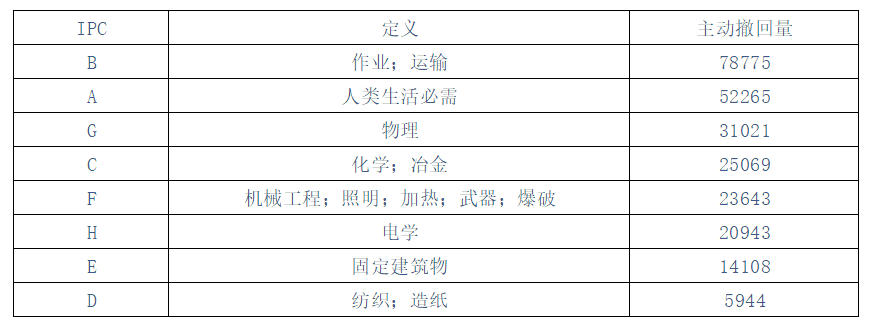 领域方面,主动撤回最多的是B部(作业;运输),占比接近40%,其次是A部(人类生活必需)。