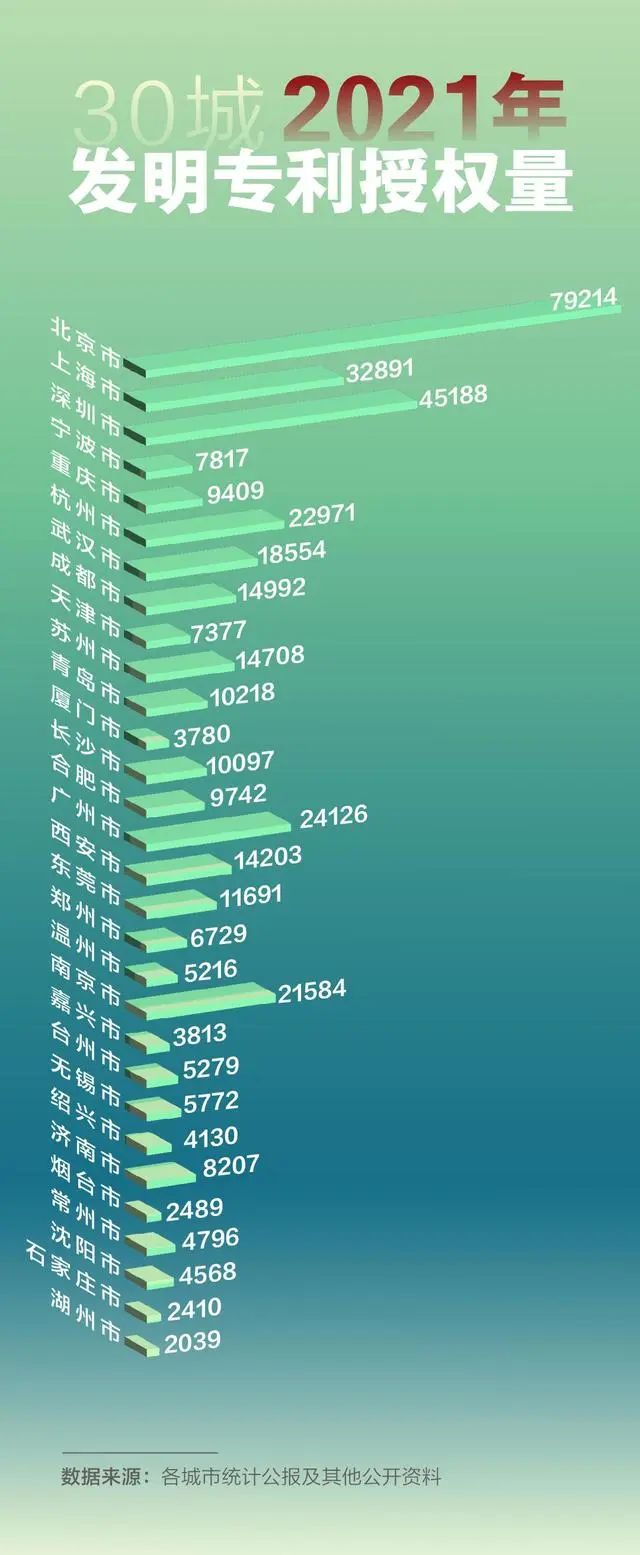 以北京为例,去年北京国家发明专利授权量达到79214项,在所有城市中排名第一。2021年北京每万人国家发明专利授权量达到36.2项,也是排名全国第一。