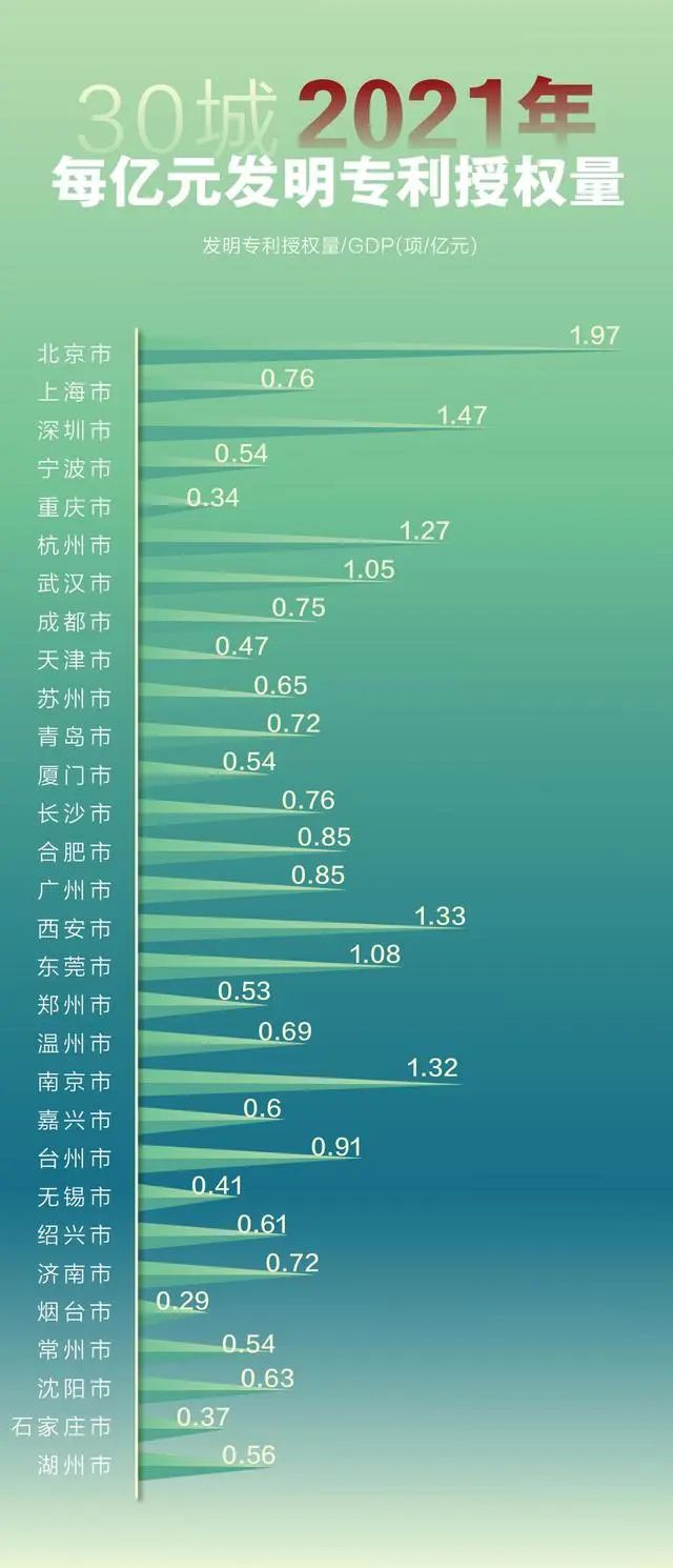 值得注意的是,如果将发明专利数量与城市的GDP放在一起比较的话,北京2021年每亿元产出的专利数量达到1.97项。